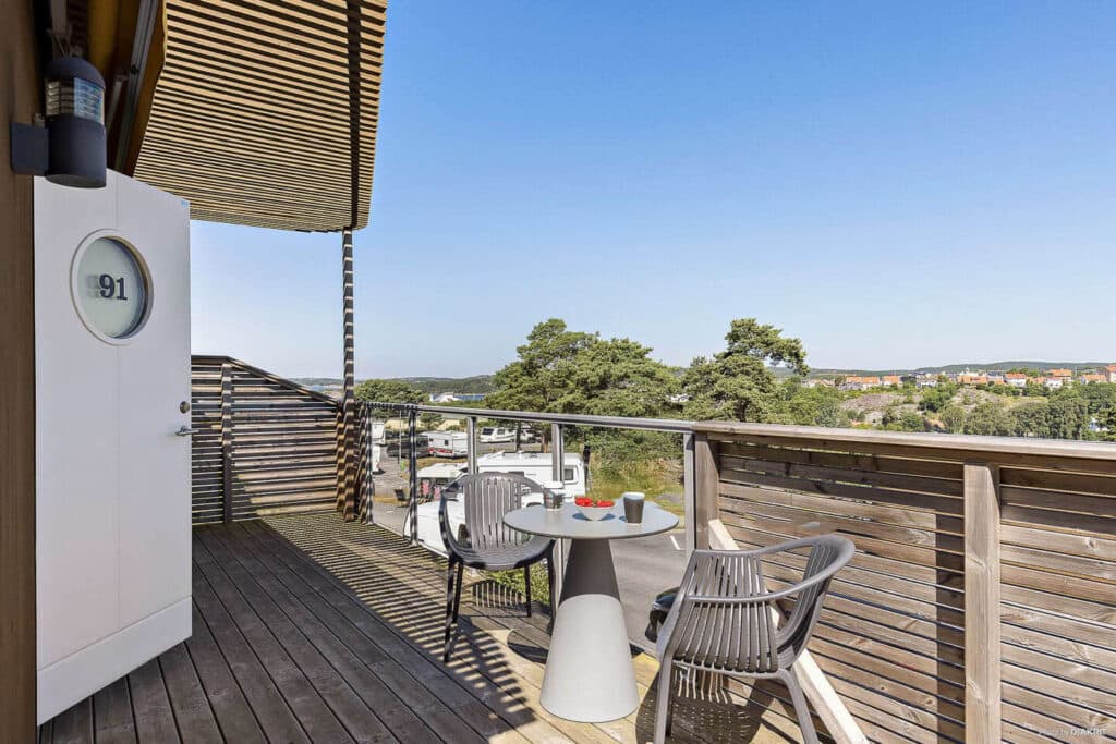 Våra härliga Kosterstugor på 24 kvadratmeter är riktigt fina och fräscha stugor. Här finner du ett modernt badrum samt en kökshörna med varmt & kallt vatten, mikro, spis, kylskåp, vattenkokare och servis (ingen köksutrustning). Stugan är utrustad med två fåtöljer med bord, en dubbelsäng och skrivbord. Allt för lite extra mys och komfort. Du njuter allra bäst av morgonkaffet eller kvällsfikat på den mysiga altanen med fantastisk utsikt över Bohuskusten. Stugan är dessutom utrustad med en AC – perfekt under varma sommardagar!