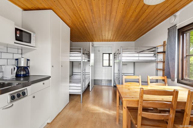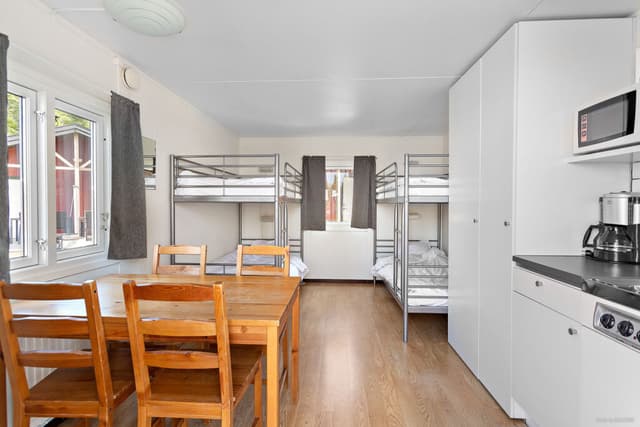 Polkagrisbyn är våra parhus på 18 kvm med fyra bäddar. I stugan finns två våningssängar och täcken och kuddar finns till stugans alla bäddar. Parhusen är utrustade med kökspentry och enklare köksutrustning, matplats för fyra personer, kylskåp med frysfack, micro, kaffebryggare, TV samt ett badrum med dusch och toalett.