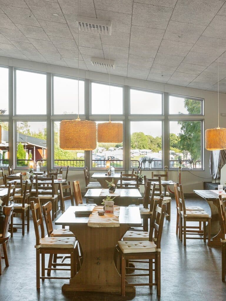 Här serverar vi mat med skön bistrokänsla, allt från enklare snacks till middagar som avslutas med goda desserter och trevlig dryck som öl och vin. Självklart finns goda alternativ för de små camparna. Maten finns även som take-away att ta med till stugan eller campingplatsen.