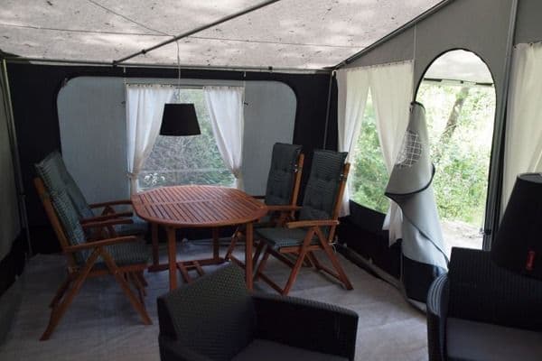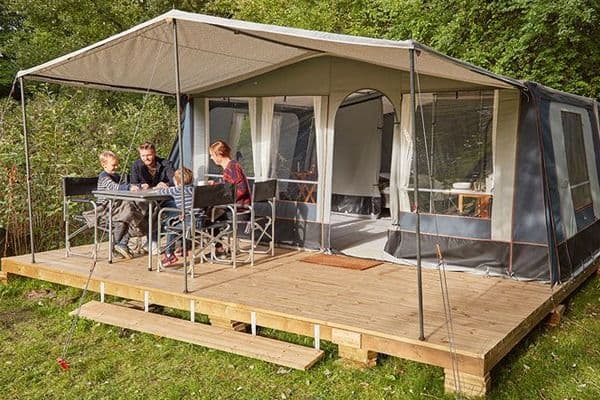 Välkommen till camping med guldkant! I det här moderna villatältet ryms 4. Njut av naturen precis utanför dragkedjan ihop med lyxen av en nybryggd kaffekopp från ditt egna lilla kök. I tältet finns kyl, vattenkokare, köksredskap, porslin och bestick samt bekväma sittmöjligheter. I hyran ingår även täcken och kuddar. Njut av alla fördelar med denna glamorösa variant av camping!