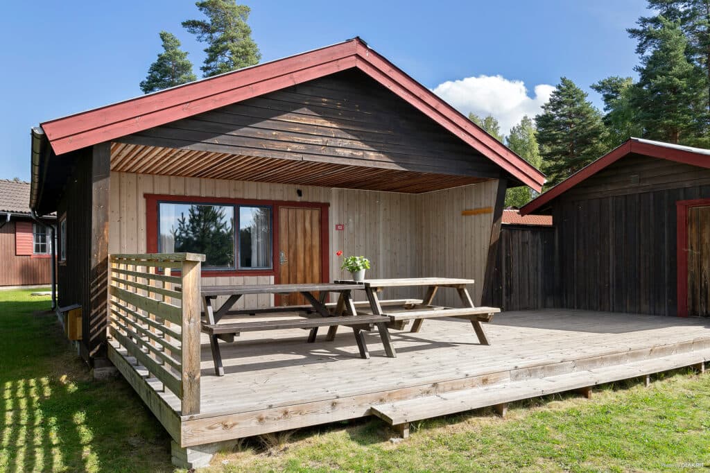 Dalstuga är en stuga på 35 kvm i stugan samt 8 kvm i en extra lillstuga bredvid. Stugan har plats för sex personer och lillstugan har plats för två personer. I stugan finns ett sovrum samt ett allrum med köksavdelning, matplats, braskamin och tv. Det finns ett sovrum med en våningssäng och det finns två våningsängar i allrummet. Täcken och kuddar finns till stugans alla bäddar. Köksavdelning med spis, ugn, mikro, fläkt, kyl, frys och kaffebryggare. Badrum med toalett och dusch finns i stugan. Lillstugan är 8 kvm och har två bäddar i familjesäng, sittplatser och tv. Altan med utsikt över campingområdet. Stugan är nära lekplatsen. Motorvärmaruttag finns till stugan.