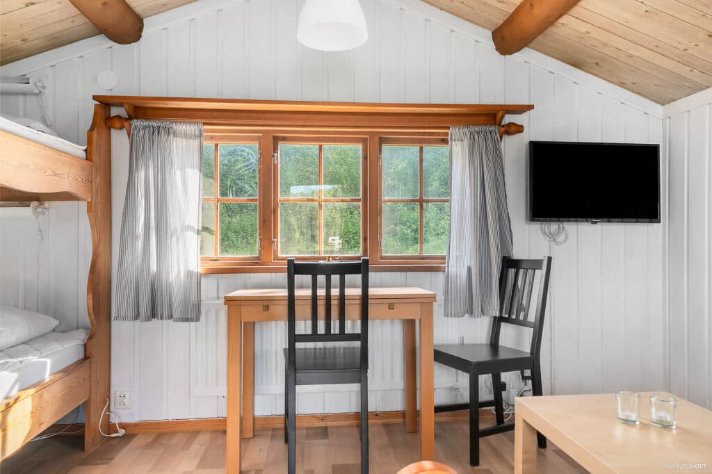 Orestuga är 18 kvm och har plats för totalt två personer. Det finns en våningssäng i stugan och täcke och kuddar finns till alla bäddar. Det finns en toalett i stugan men ingen dusch, det finns i servicehuset att nyttja. Tv och matplats finns, samt kök utrustat med spis, ugn, kyl och kaffebryggare. Motorvärmaruttag finns till stugan. De första bilderna visar stuga nummer 61. Observera att stugorna skiljer sig åt från nummer till nummer.
