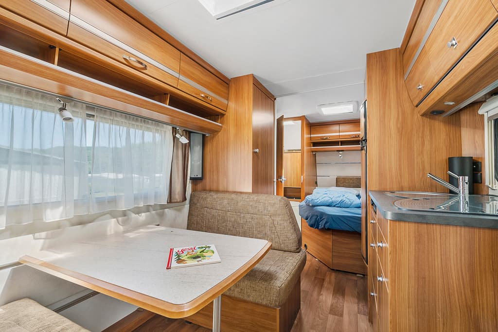 Inuti husvagnen: Husvagnen är avsedd för max. 6 pers. Det finns våningssängar, en ¾ säng samt en rundsittgrupp som kan omvandlas till sovplats. Det finns en extra säng i förtältet.