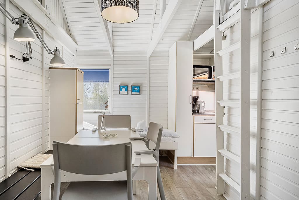 Stugorna är designade för max 2 vuxna och 2 barn. Stugorna är rökfria. Härlig välutrustad stuga med ett loft med plats för 2 personer, ett mysigt vardagsrum med mycket soffplats. Men ett vardagsrum som även fungerar som sovrum, plats för 3 personer, matplats, fin köksnisch med spishäll, mikrovågsugn, kyl m/frys, kaffebryggare, allt i tjänst, varmt & kallt vatten. Stugorna är rökfria. Du hittar trädgårdsmöbler och en grill på den härliga terrassen. Lätta täcken och kuddar finns i kabinen. Det finns inget bad eller toalett i stugan, här används närmaste servicebyggnad. Stugpriser är inkl. el, värme och vatten.