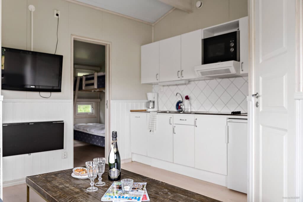 Välkommen till vår Brooktorpstuga med plats för upp till fem personer. I stugans kök lagar du enkelt din egen middag. Här finns spis och den mesta köksutrustning du kan tänkas behöva. Perfekt för dig som vill slitta lämna stugan och njuta av måltider tillsammans med ditt resesällskap. Stugans bäddar är fördelade i två sovrum, ett med dubbelsäng och ett med våningssäng och en enkelsäng. Samtliga sängar har komfortmadrasser. I stugan finns ett badrum med toalett och dusch. I allrummet kan du även slappna av med lite TV-tittande. Precis utanför dörren finns en uteplats i söderläge. Uteplatsen är utrustad med bord och fyra stolar. Finns det något bättre än frukost i det fria? Husdjur är inte tillåtna i dessa stugor.