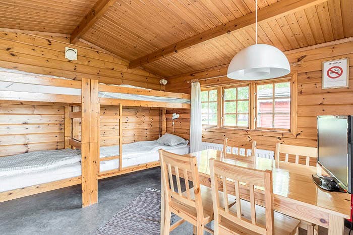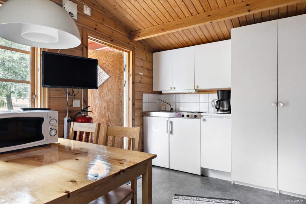 Här är en liten mindre och mysig stuga som rymmer upp till fyra personer. Stugans yta är på 15 kvm och bäddarna är fördelade på två våningssängar som som finns i allrummet. I stugan finns ett pentry med enklare köksutrustning, kyl, micro och kaffebryggare. Utanför stugan finns en trevlig altan med ett bord och stolar, perfekt för dig som vill njuta av morgonkaffet eller en en måltid ute bland den härliga omgivningen.