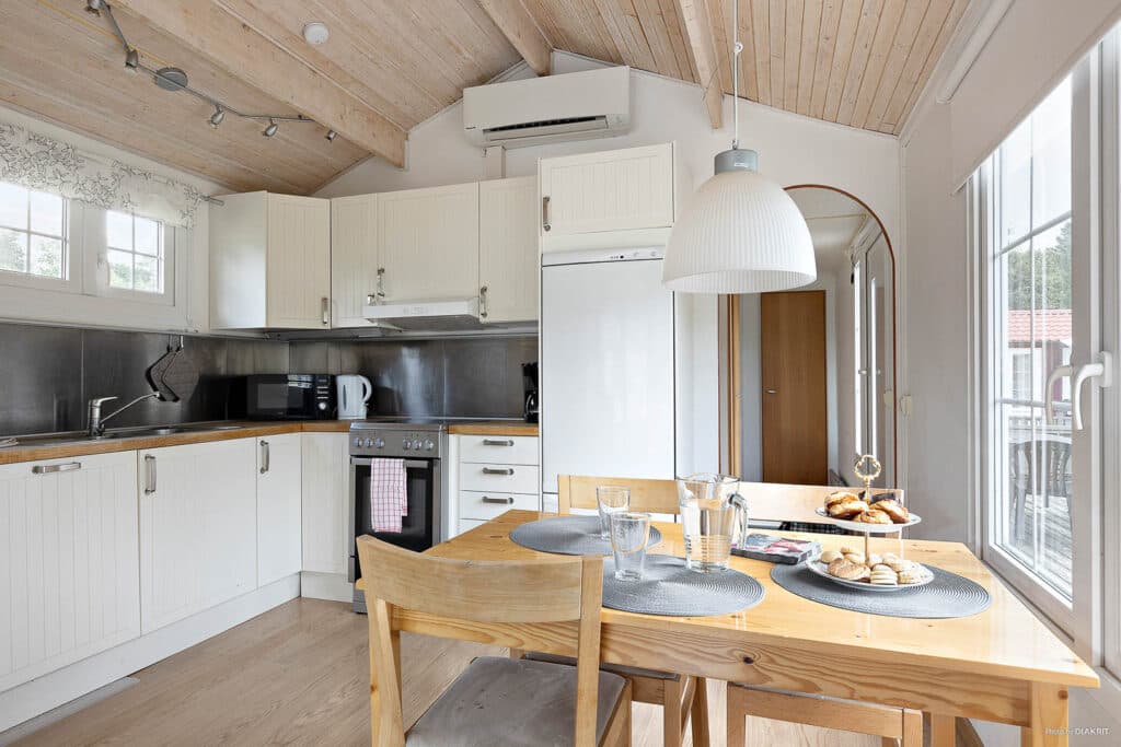 Villavagnarna har en yta på 40 kvm, med plats för upp till fyra personer. Bäddarna är fördelade på två sovrum, varav ett med våningssäng och ett sovrum med dubbelsäng och en hörna med skrivbord. I villavagnen finns kök med spis, ugn, mikro, kyl, frys samt kaffebryggare och husgeråd. I villavagnen finns toalett och dusch samt tvättmaskin, I allrummet finns matplats, soffa samt TV och dvd. Utanför villavagnen finns en stor och trevlig uteplats med trädgårdsmöbler. Perfekt för dig som vill njuta av goda måltider utomhus tillsammans med nära och kära. I villavagnarna är dessutom husdjur välkomna.