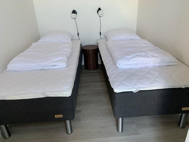 Två enkelsängar i vardera sovrum och ytterligare två sovplatser i bäddsoffan i allrummet
