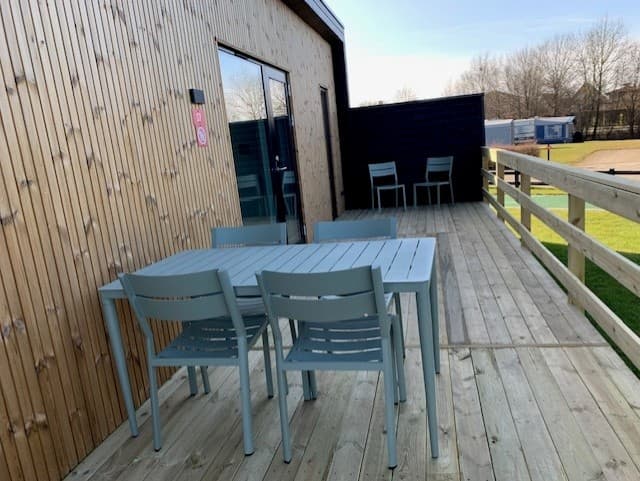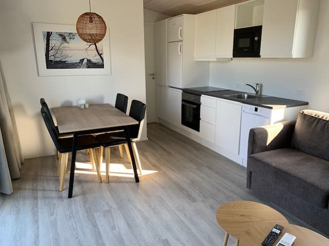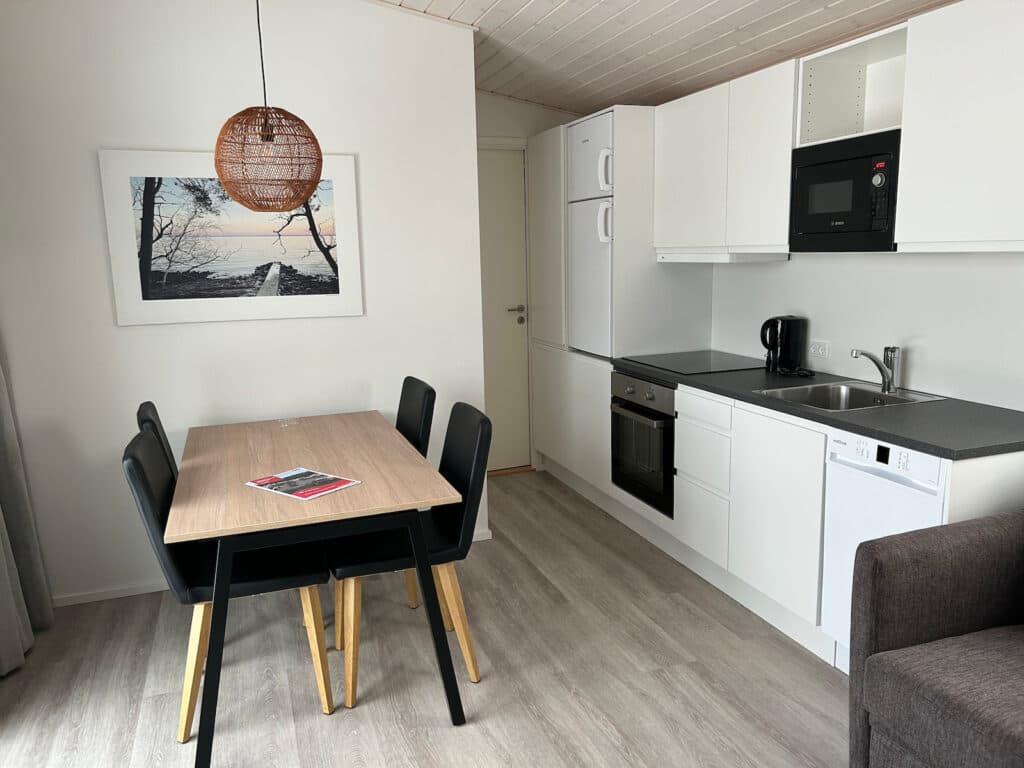 I stugans allrum finns ett utrustat kök med porslin, ugn, induktionshäll, mikro, kyl, frys och diskmaskin. Här finns även en soffa och TV med Chromecast för mysiga stunder tillsammans. Utanför väntar en altan där du kan njuta av morgonkaffet eller bara koppla av en stund. I stugan finns även dusch och toalett. För extra komfort är stugan dessutom utrustad med luft/luft värmepump med AC, vilket ger ett behagligt inomhusklimat året runt.