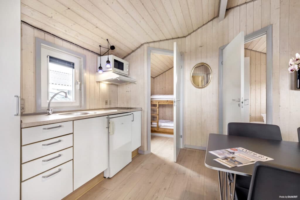 2 rum, 1 med 120 x 200 säng – 1 med våningssäng. Perfekt för 2 vuxna och 2 barn. Kök allrum med fullt utrustat kök för 6 personer, kyl, spis, matbord, platt-TV och bäddsoffa med plats för upp till 2 personer. Det finns täcken och kuddar för 6 personer och sängkläder kan hyras eller ta med. Dessutom finns ett eget badrum med toalett/badkar och utanför en liten terrass med bord och stolar där du kan njuta av utsikten över solnedgången.