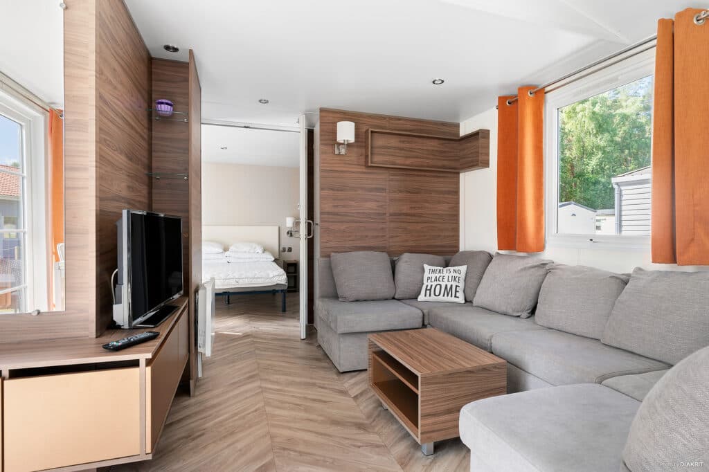 Denna stuga har ett modernt kök utrustat med rymliga skåp, spis, ugn, kyl och frys. Rymligt vardagsrum med bekväm soffa, soffbord, TV och matsalsbord och fyra stolar. Ett sovrum med dubbelsäng, mycket rymlig garderob, toalettbord och terrassfönster. Två små sovrum med enkelsängar och garderober. I stugan finns även ett badrum med dusch och handfat och en separat toalett. Här finns även elvärme.