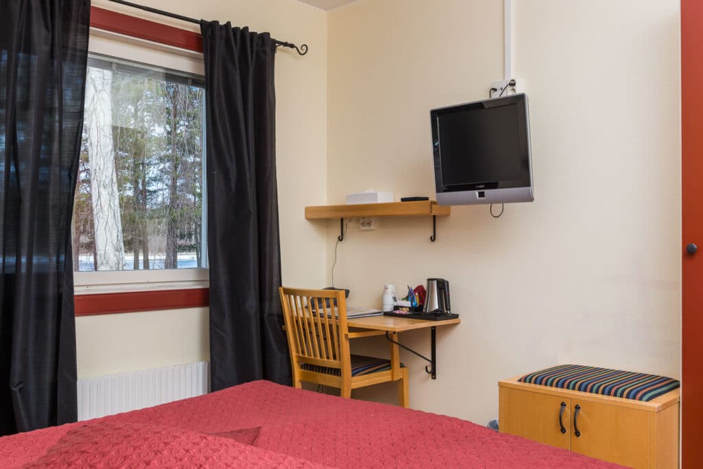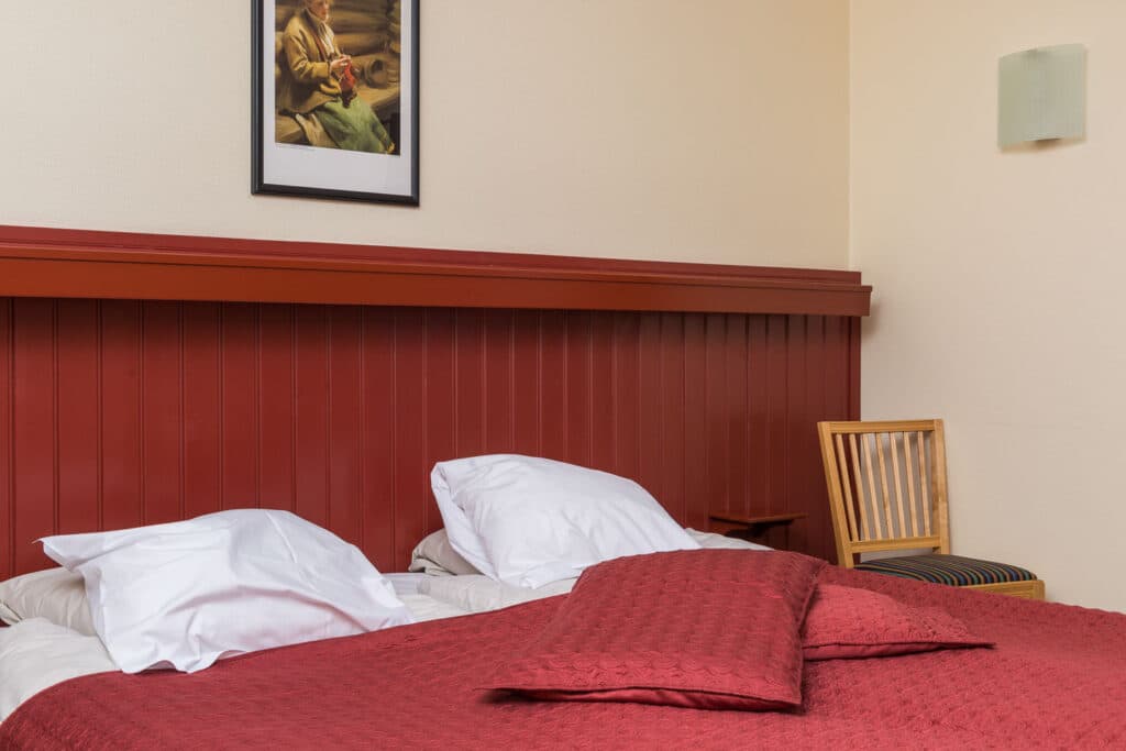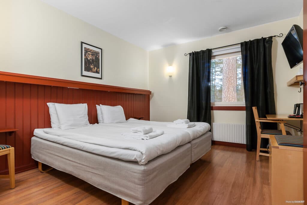 Dubbelrum på hotellet. I rummet finns två enkelsängar som står ihop som en dubbelsäng. Vattenkokare, strykjärn och strykbräda finns i rummet, lakan och handduk ingår. Badrum med dusch, toalett och hårfön. TV-kanaler: SVT1, SVT2, TV3, TV4, Kanal5, TV6, Viasat Sport och Barnkanalen. Frukost, sängkläder och städning ingår.