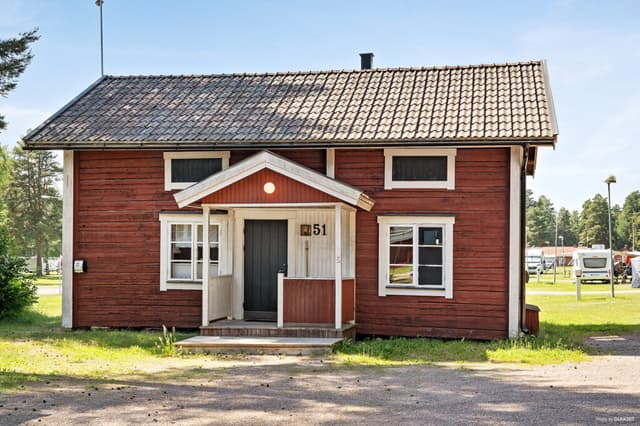 Risagården Plus är en stuga i dalastil på 46 kvm med sex bäddar. Stugan har två våningar.