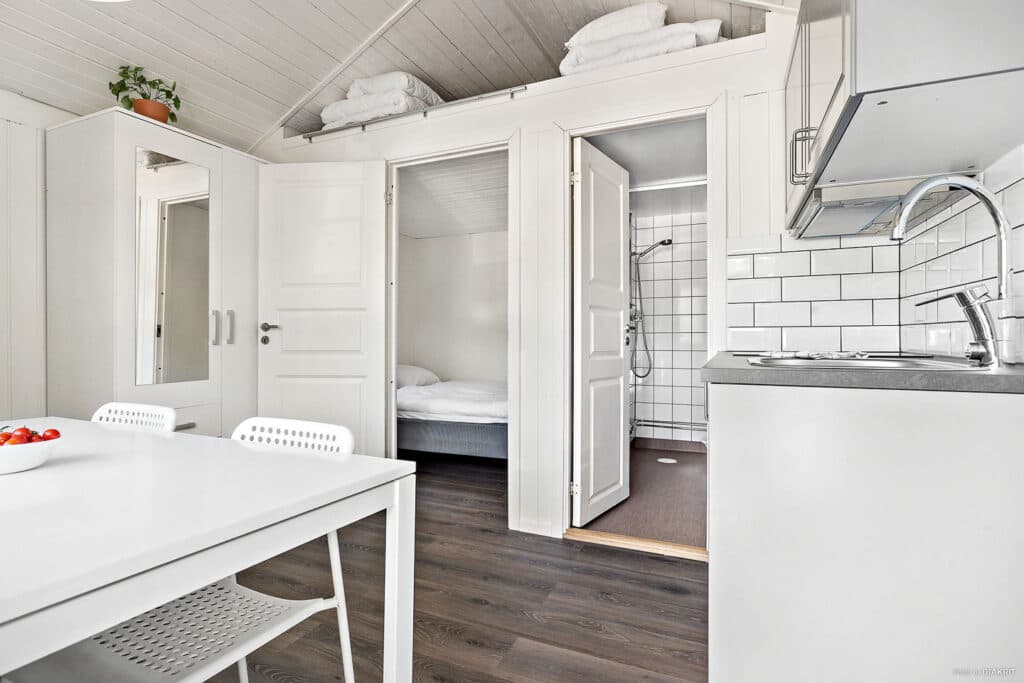 Välkommen till en modern stuga som rymmer upp till fyra personer. Bäddarna är fördelade på en sovhytt med dubbelsäng samt sovloft för barn med 2 madrasser. I stugan finns ett enkelt utrustat pentrykök med kyl, spis, kaffebryggare och porslin för fyra personer. I stugan finns även ett privat badrum med dusch och toalett. På den möblerade verandan finns gott om rum att njuta av morgonkaffet eller en god måltid tillsammans med nära och kära. Här bor du dessutom nära både strand och lekplats.