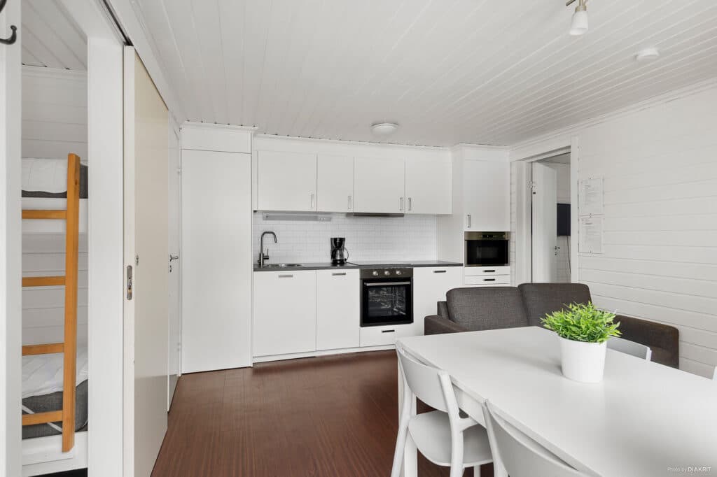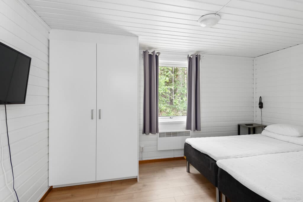 Lyxa till det i välutrustade Nydalastuga med renoverat kök och allrum. Stugorna är 30 kvm stora och har plats för 6 personer. I det stora sovrummet myser ni ner er i sängen och tittar på en bra film på TV. I det andra rummet turas barnen om att sova i våningssängarnas spännande överslafar. Täcken och kuddar finns till stugans alla bäddar. I det kombinerade kök/allrummet finns kyl/frys, spis, ugn, kaffebryggare, diskmaskin och mikro. Här finns även soffa och TV. Badrummet har dusch och toalett. Utanför dörren varvar ni ned på den möblerade uteplatsen efter en dag på stranden eller i löparspåren. Parkering finns intill stugan.