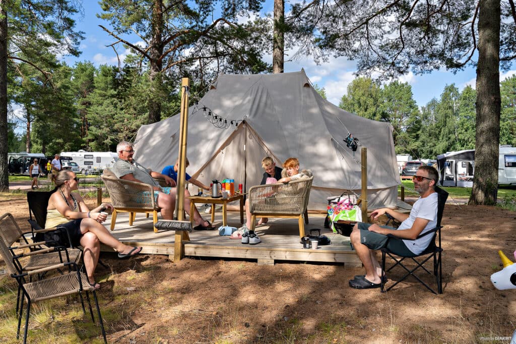 Ett mer strandnära boende än såhär kan du inte hitta. Här bor du på 20 trevliga kvm och kan njuta av ett riktigt mysigt och unikt boende. I tältet finns plats för upp till fyra personer. De bekväma bäddarna har en riktig hotell-känsla och här sover du gott med naturen som närmsta granne. I tälten finns även en kyl för det mest nödvändiga. I anslutning till tältet finns en trevlig veranda, perfekt för dig som vill fika utomhus och samtidigt kunna njuta av sommarvärmen, fågelkvitter och den fantastiska utsikten. Vänligen observera att indraget vatten och kök ej finns i tältet. Faciliteter som dusch, toalett och kök finns i närliggande servicehus på området.