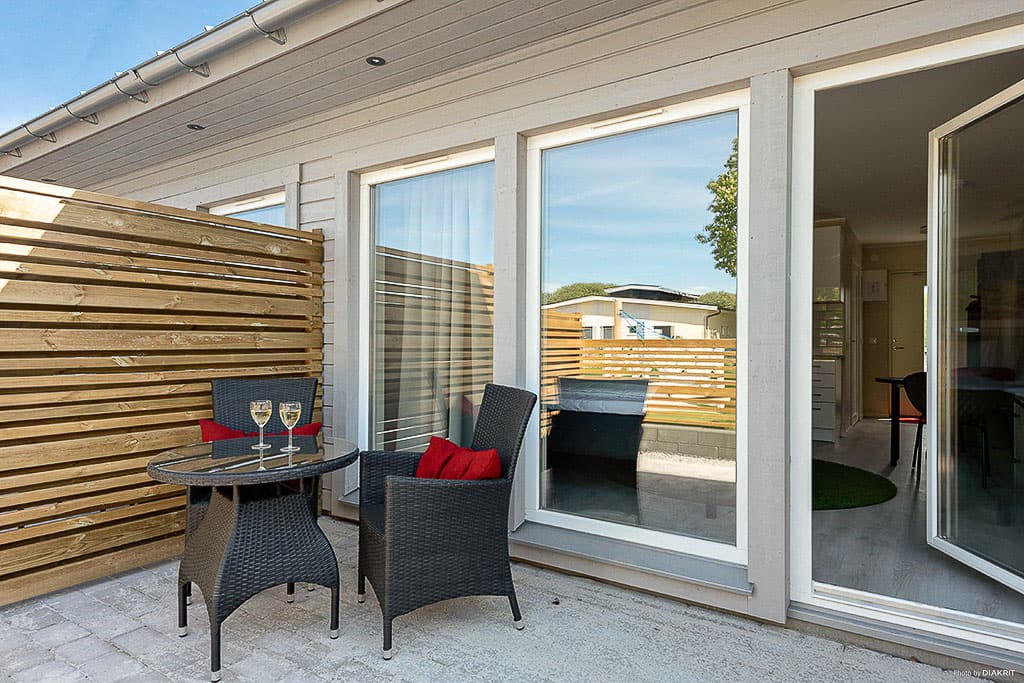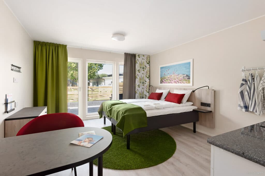 Bekvämt boende på 26 kvm är utrustade med såväl kök som eget badrum och hyrs till hotellstandard – alltid bäddade och klara för din nästa vistelse. I radhuset har du egen ingång och uteplats med friheten från en stuga och standarden från ett hotellrum, bekvämt och nära till staden och naturen. I pentryt finns två kokplattor, kyl, mikro, och kaffebryggare. Det finns en matplats för två samt en tv. Med fönster från golv till tak får du ett härligt ljusinsläpp i rummet. Badrummet är inrett med dusch och toalett.
