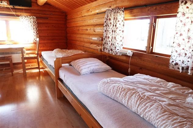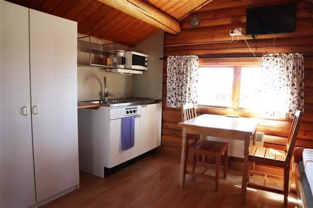 Tinastuga är 15 kvm och har plats för två personer. I stugan finns två enkelsängar med täcke och kudde. Köket är utrustat med mikro, kyl, spis och kaffekokare samt husgeråd. Stugan har TV. Badrummet har dusch och toalett.