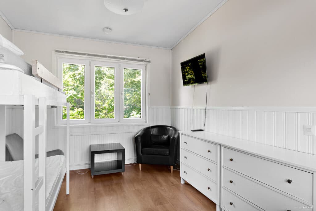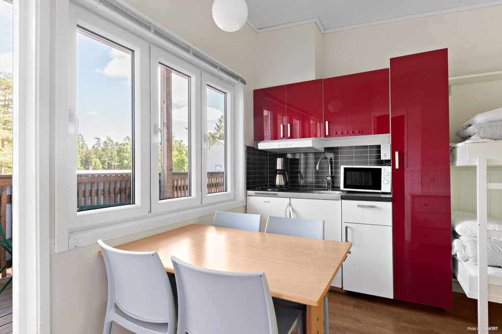 En modern lägenhet på 22 kvm med sex bäddar – två våningssängar och en dubbelsäng. Till varje säng finns madrass, täcke och kudde. Stugan är inredd med matbord och stolar för hela sällskapet. I vardagsrummet finns två fåtöljer, soffbord och byrå. Köket har två kokplattor, kylskåp, mikrovågsugn och två kokkärl samt de viktigaste köksredskapen och servis för sex personer. I lägenheten finns rinnande vatten och diskbänk. Toaletter och duschar finns i ett gemensamt utrymme precis utanför lägenheten och delas med boende i de andra lägenheterna.
