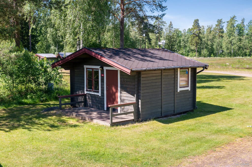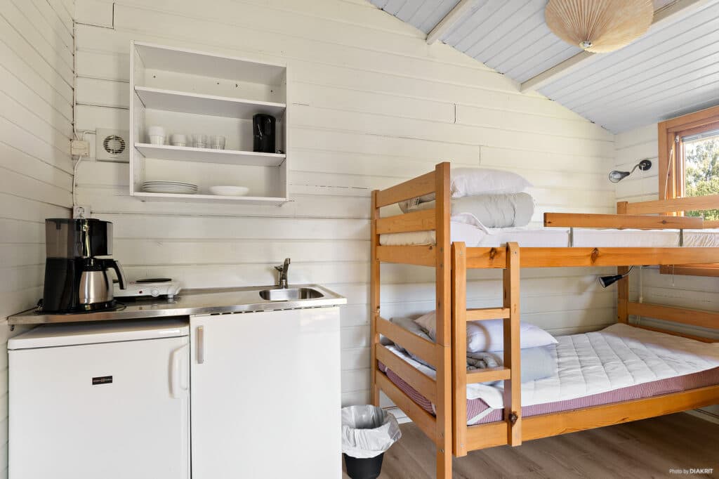 En något större hemtrevlig stuga på 16 kvm med fyra bäddar fördelat på två våningssängar. Övre sängen är 80 cm och den undre är 120 cm. Till varje säng finns madrass, täcke och kudde.