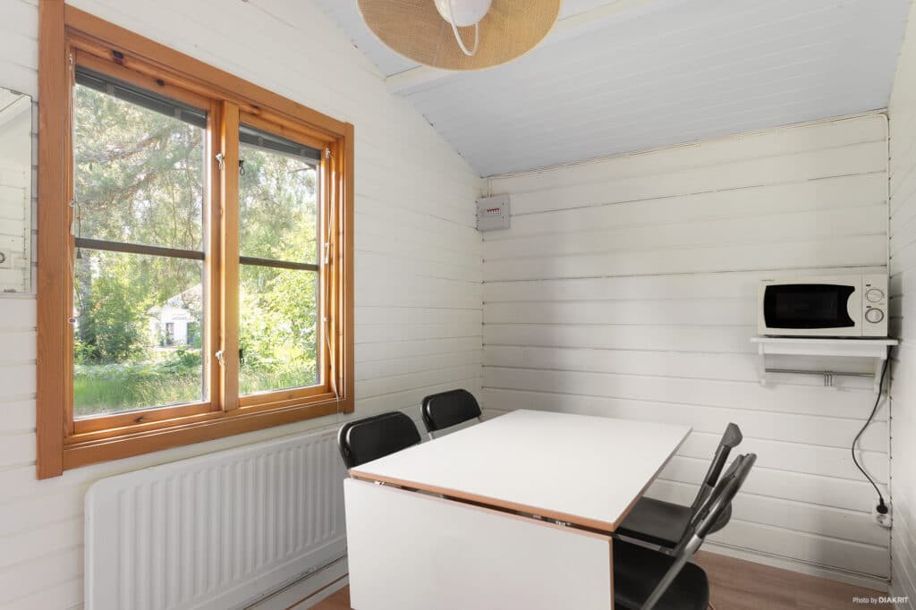Stugan är inredd med matbord och stolar. Köket har kylskåp, mikrovågsugn, två kokplattor, två kokkärl samt de viktigaste köksredskapen och servis för sex personer. Om ni önskar en stekpanna är ni varmt välkomna att låna en från receptionen.