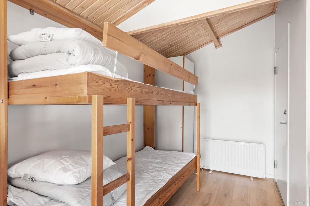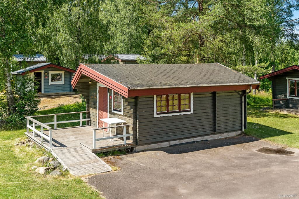 En något större hemtrevlig stuga på 16 kvm med fyra bäddar fördelat på två våningssängar, samt en extra bädd. Övre sängen är 80 cm och den undre är 120 cm. Till varje säng finns madrass, täcke och kudde. Stugan är inredd med matbord och stolar. Köket har kylskåp, mikrovågsugn, två kokplattor, två kokkärl samt de viktigaste köksredskapen och servis för sex personer. I stugan finns dusch och toalett. Om ni önskar en stekpanna är ni varmt välkomna att låna en från receptionen.
