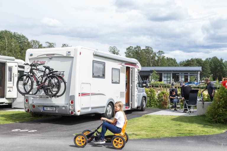 Besöker du oss med husbil så kan du välja om du vill stå på våra husbilsplatser eller några av våra andra fina campingtomter. Våra husbilsplatser med el på asfalt har gräs och stenlagd yta intill och är 10 m djupa och 8 m breda. Platserna har en trevlig grönskande häck runt om för att rama in tomterna. Platserna ligger nära infarten till campingen och har nära till hoppkuddar, lekplats, bistro och receptionen.