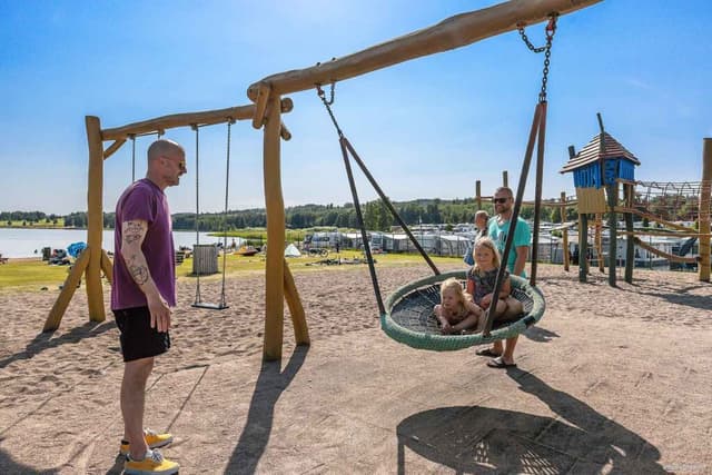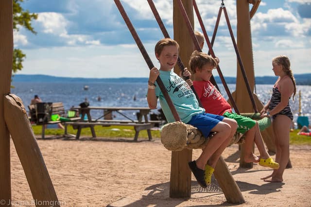 Vid stranden finns en häftig lekpark för barn i alla åldrar. Här hittar du både klätterställningar, gungor och sandlådor. Låt barnen leka av sig samtidigt som du som vuxen kan njuta av den vackra och härliga omgivningen intill stranden. Det finns även en mindre lekpark vid stugorna.