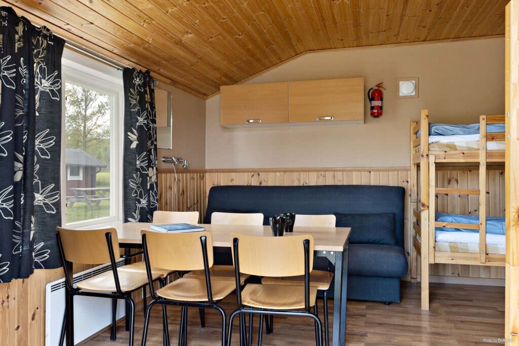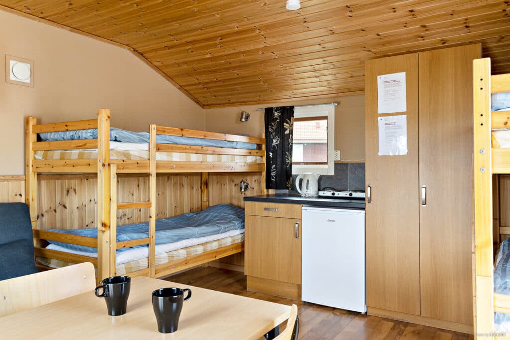 Bäddarna består av två våningssängar samt en bäddsoffa för två personer.