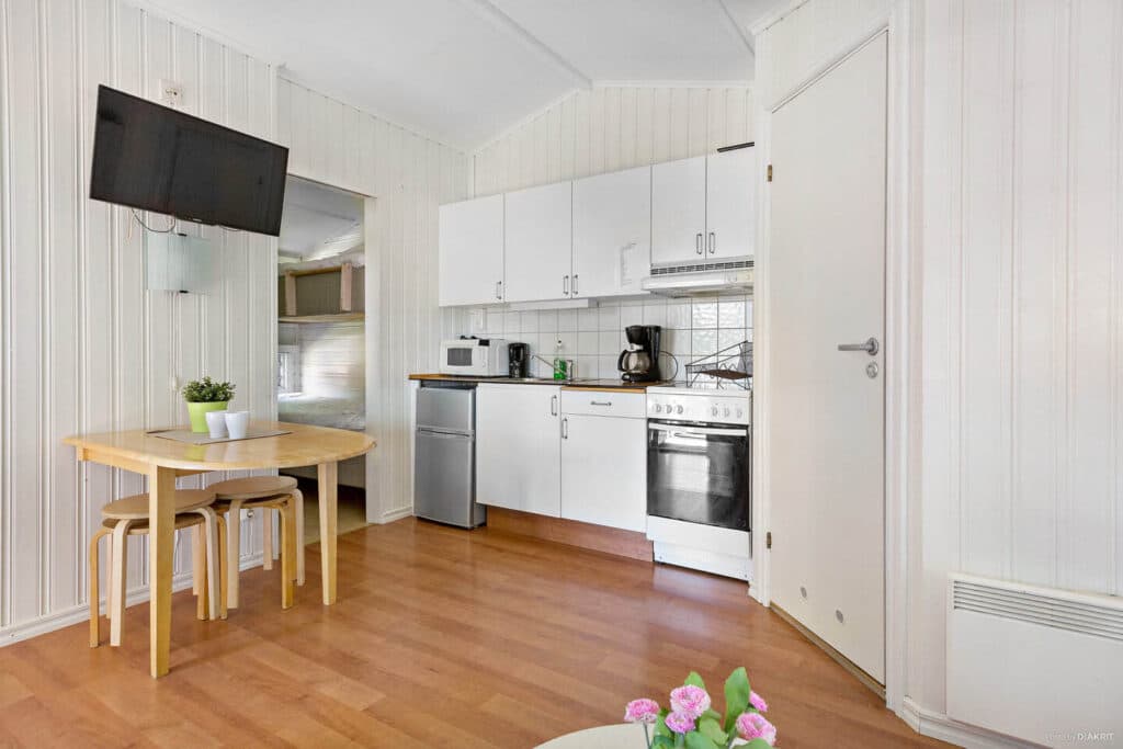 I denna stuga bor du på 25 kvm och här finns två separata sovrum, ett med en 80cm säng samt ett med en våningssäng (80cm) plus en loftsäng. Det finns alltså plats för upp till fyra personer. I stugan finns dusch och toalett, kök med spis, ugn, kylskåp, mikro och kaffebryggare samt tv med grundutbud. Till stugan hör även en trevlig altan med utemöbler. Perfekt för dig som vill njuta av morgonkaffet eller goda semestermiddagar tillsammans med nära och kära. För extra bekvämlighet finns även en parkeringsplats intill stugan. Rökfri men tillåtet att medföra husdjur.